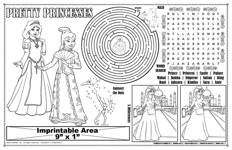 Our imprintable placemats are all 18″ wide by 12″ high and will keep a child or adult entertained for many hours. Don’t let anybody play with their food – give them a placemat to play with instead. These fun-filled placemats and are a hit with kids, and now adults, at restaurants, special events, schools, birthday parties and more! Featuring various themes (butterflies, dinosaurs, ocean, princesses, space, trains), they can complete fun activities like a maze, a word search, and connect-the-dots as well as color.